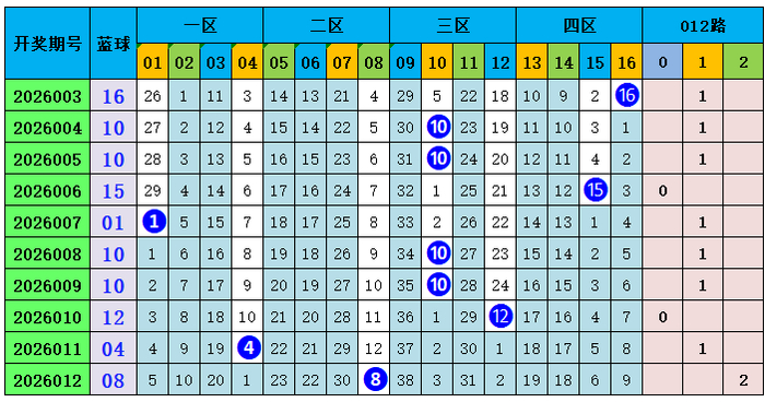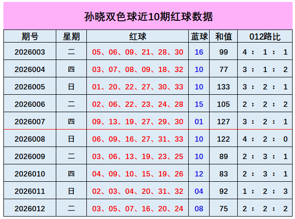 上期回顾:双色球第2026012期开出奖号:红球03、05、07、16、20、24;蓝球08,其中红球和值为75,012路比为2:2:2,奇偶比3:3,蓝球开出小偶数号码08。