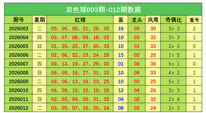 双色球第2026012期开奖奖号:红球03、05、07、16、20、24,蓝球08。龙头03,凤尾24,奇偶比3:3,开出2枚重号。