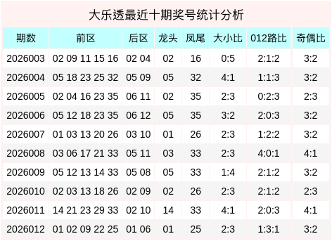 大小比分析:上期前区奖号大小比为2:3,最近10期前区大小比为22:28,小数较热,本期注意小数热出,参考大小比2:3。