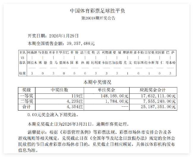 北京时间1月29日,足彩第26019期开奖结果揭晓。14场1等开出119注,单注奖金148169元;14场2等开出4235注,单注奖金1784元;任九开出9736注,单注奖金1202元。本期足彩销量为39,357,486元,开云app官方下载任九投注总额为18,288,572元。